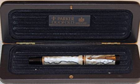Description: With the Duofold Parker brought to a second life one of the flagships of the old times, renewed with actual materials and technologies. A great success until these days. This fpen has its body made of mother of pearl resin with black veins and a splendid nib of 18 ct solid gold. New in original box with papers. Negotiable price. |