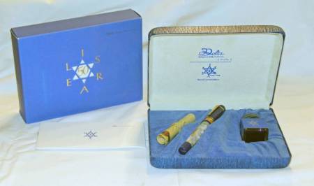 Description: With this Special Limited Edition Delta celebrated the 50th Aniversary of the independence of the State of Israel, declared by Ben Gurion the 14th of May 1948. The pen is made of marbled blue and white mother of pearl vegetable resin with an engraved ring of goldplated silver (vermeil). 948 pieces ere made, having this one the no. 366/948 engraved on the body. The nib is of 18 ct solid gold. In its original box, wich brings a bottle of ink and a ’facsimile’ of the Declaration of Independence. Brand new in original box with papers. Negotiable price.